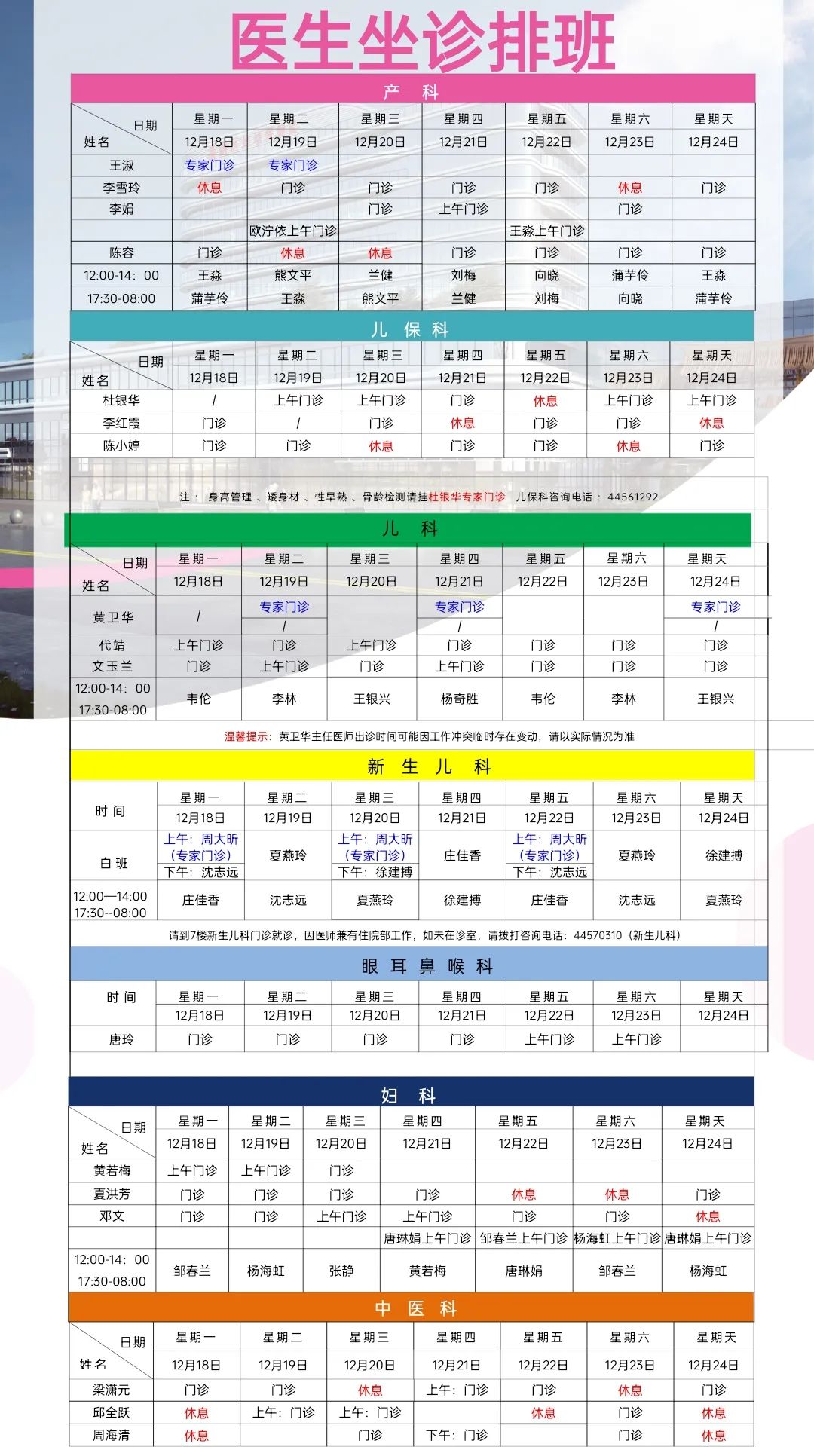潼南区妇幼保健院2023年12月18日—24日产科、儿科、儿保科、妇科、新生儿科、中医科医生坐诊排班情况如下(如有变动,请以当日实际情况为准)。