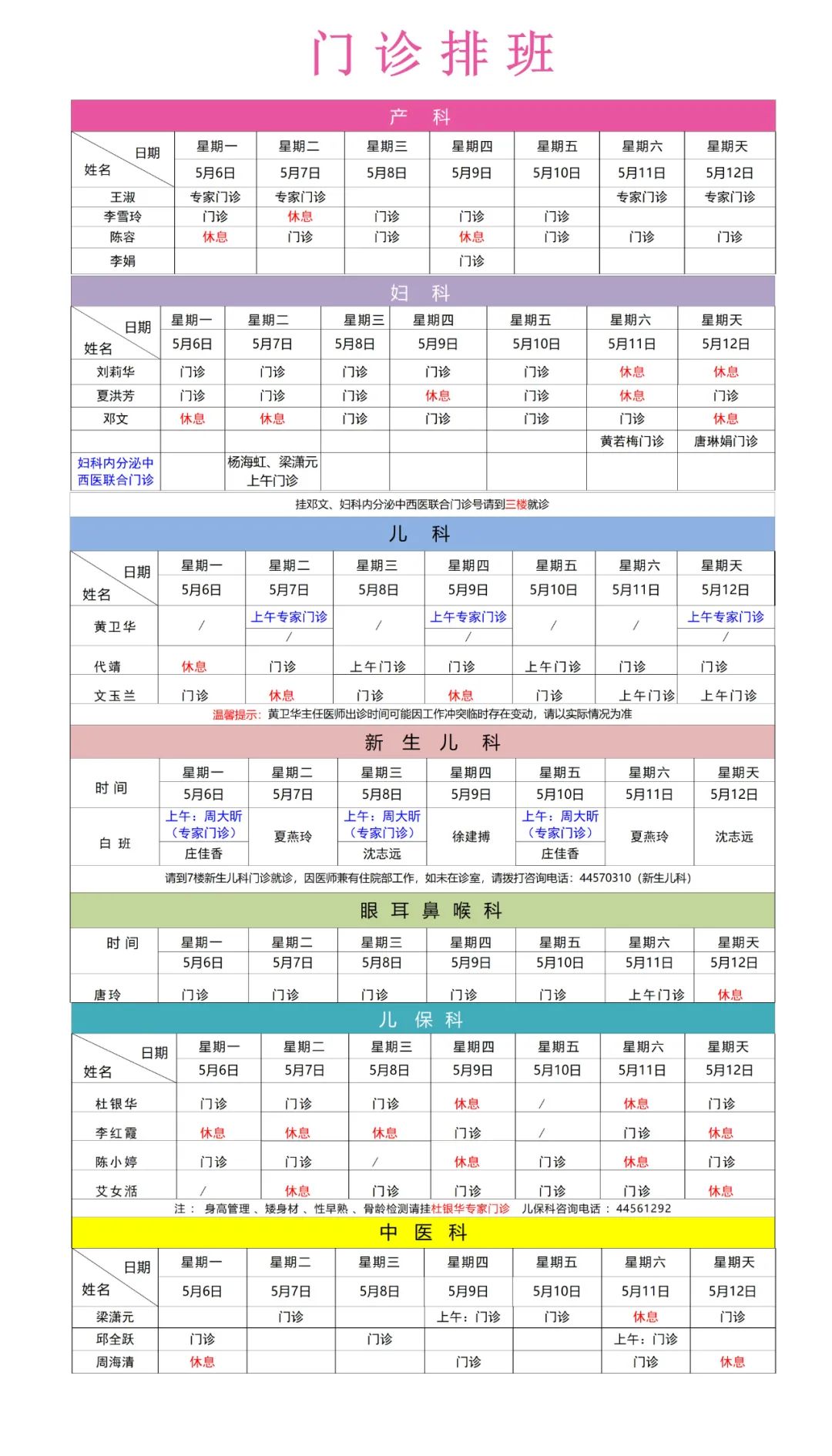 潼南区妇幼保健院2024年5月6日—5月12日各科室门诊排班情况如下(如有变动,请以当日实际情况为准)。