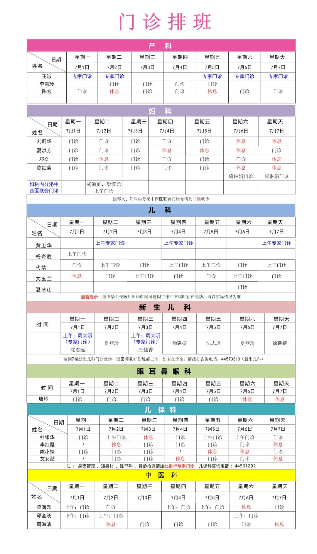 潼南区妇幼保健院2024年7月1日—7月7日各科室门诊排班情况如下(如有变动,请以当日实际情况为准)。