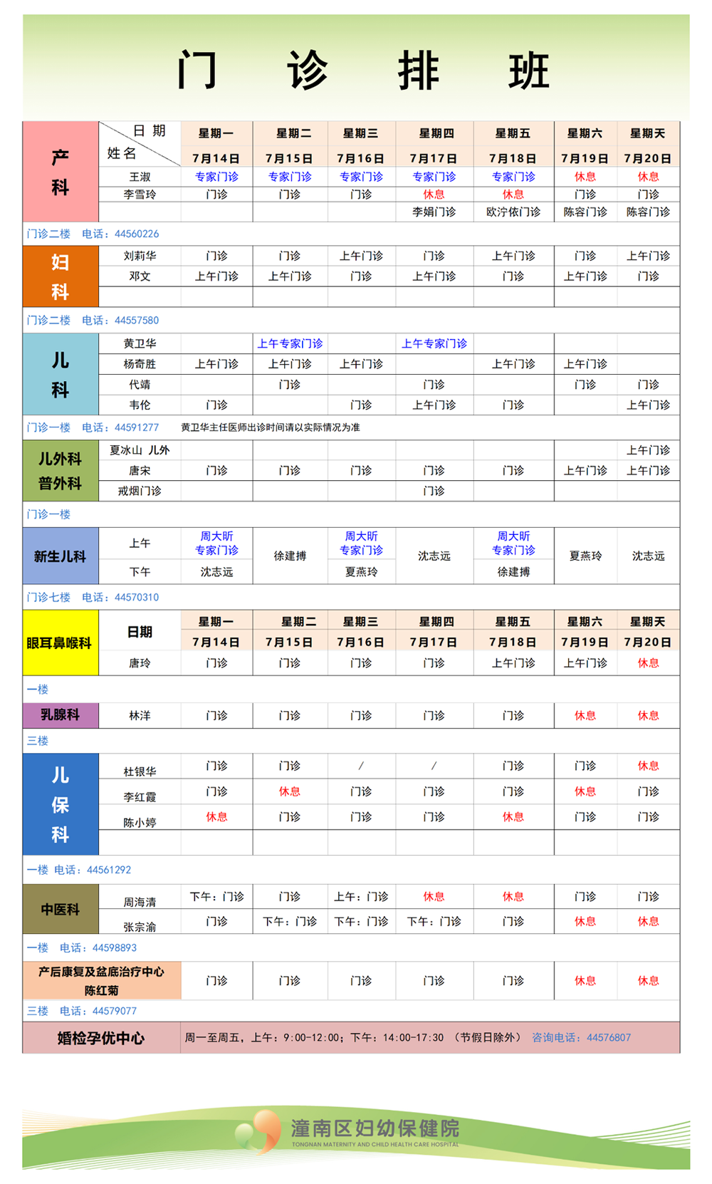 潼南区妇幼保健院2025年7月14日—7月20日各科室门诊排班情况如下(如有变动,请以当日实际情况为准)。