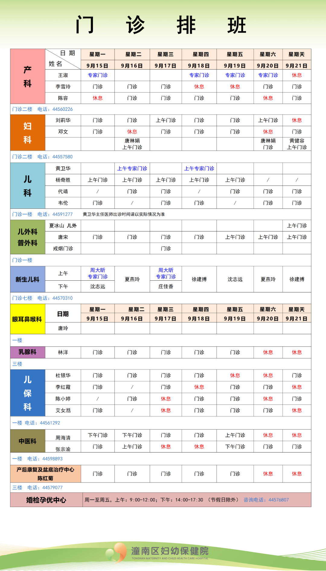 潼南区妇幼保健院2025年9月15日—9月21日各科室门诊排班情况如下(如有变动,请以当日实际情况为准)。