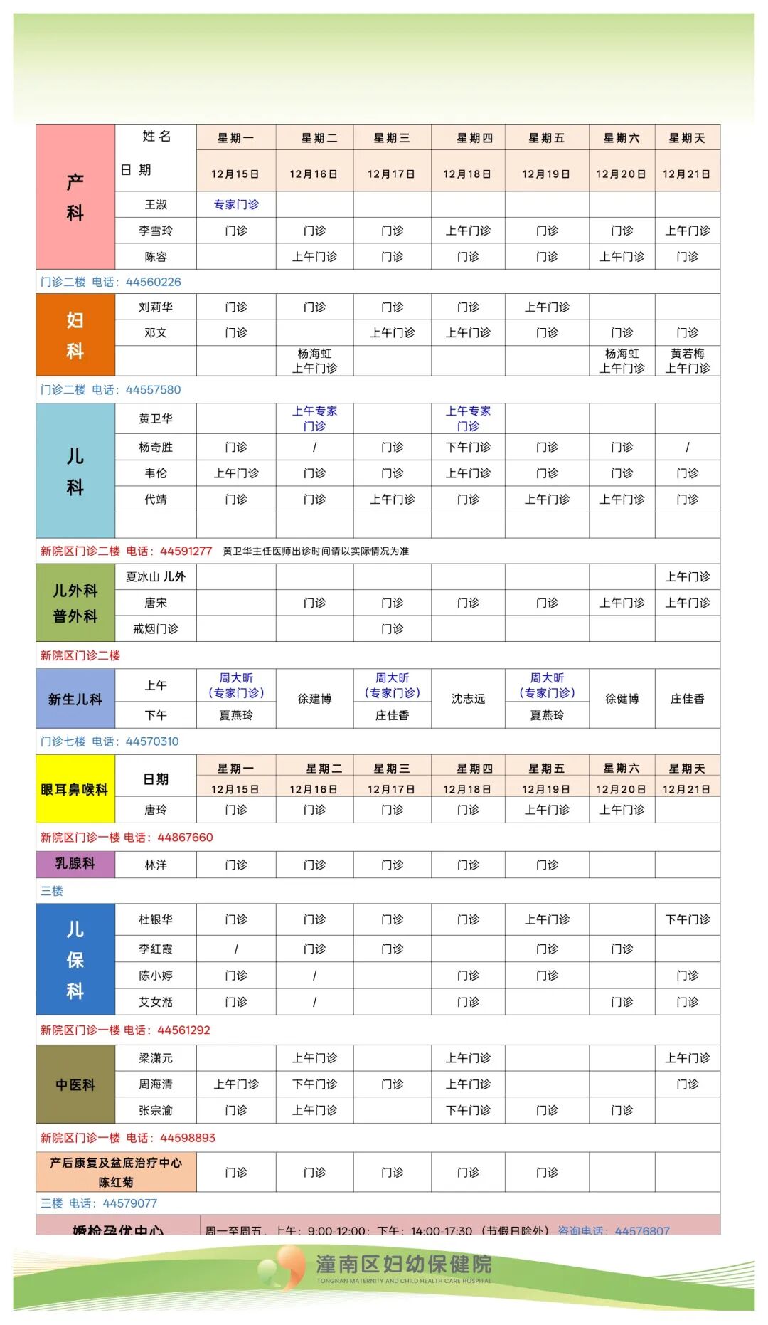 潼南区妇幼保健院2025年12月15日—12月21日各科室门诊排班情况如下(如有变动,请以当日实际情况为准)。