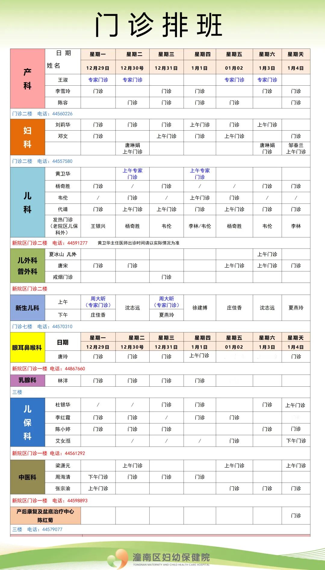 潼南区妇幼保健院2025年12月29日—1月4日各科室门诊排班情况如下(如有变动,请以当日实际情况为准)。