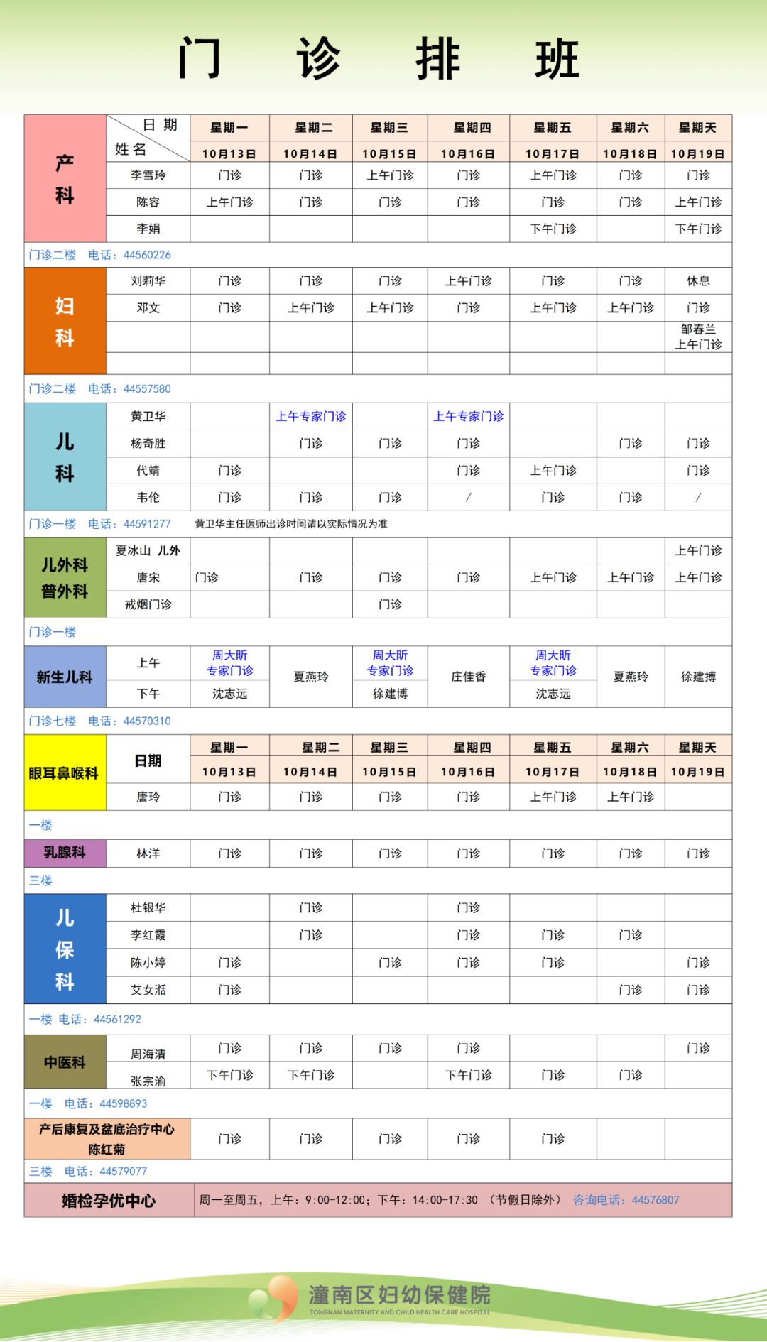 潼南区妇幼保健院2025年10月13日—10月19日各科室门诊排班情况如下(如有变动,请以当日实际情况为准)。