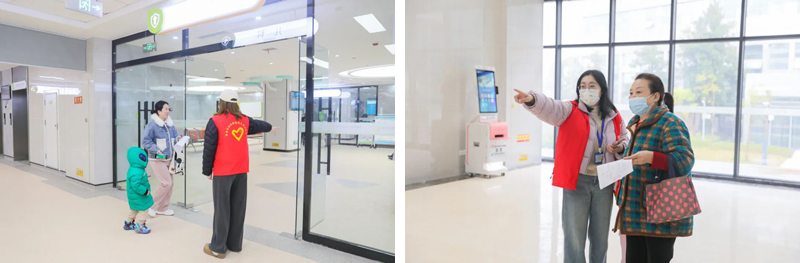 志愿者身着红马甲,在各楼层电梯口、科室门口、自助机旁随时待命,为患者提供路线指引、就诊协助等服务。