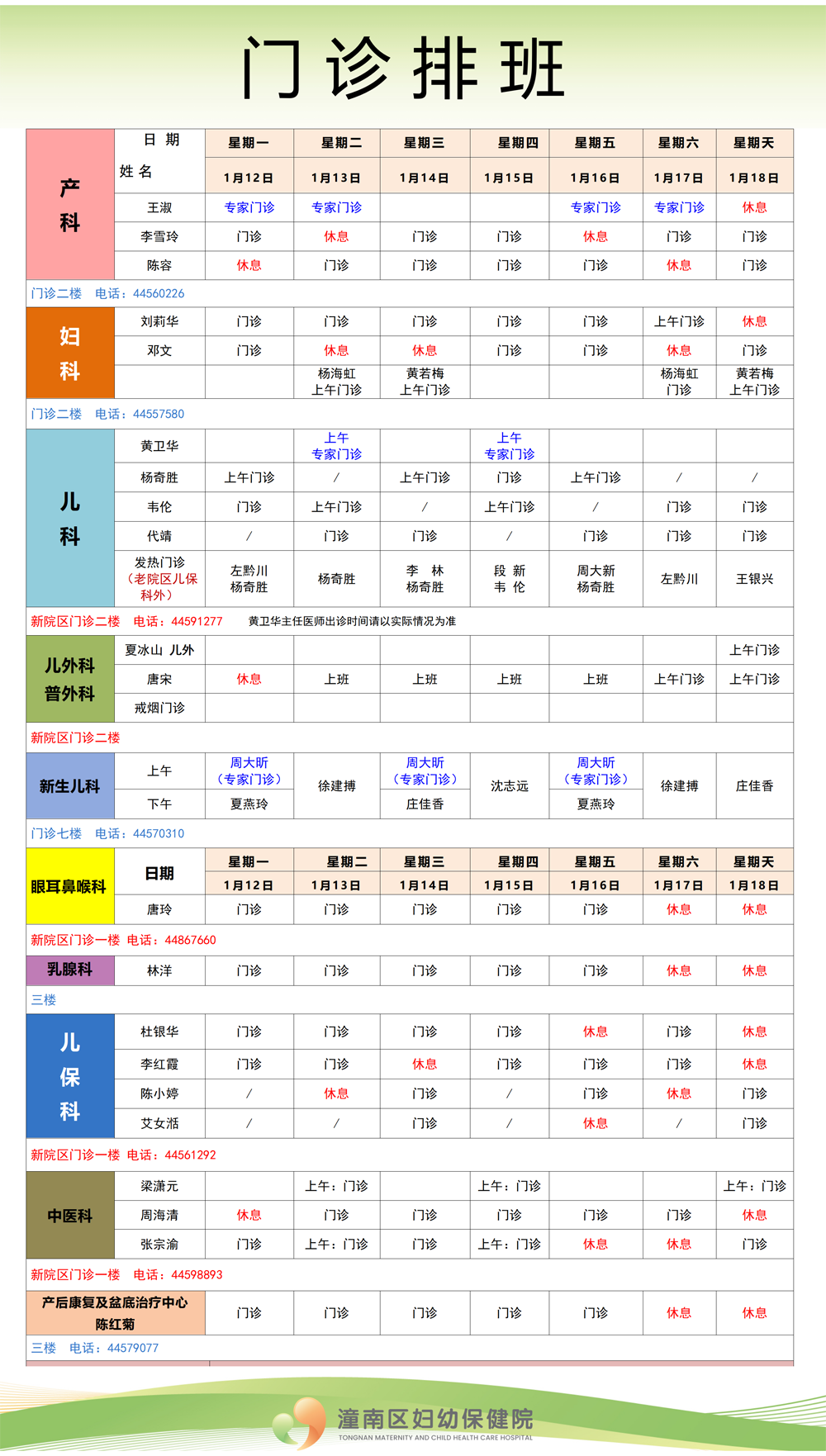 潼南区妇幼保健院2026年1月12日—1月18日各科室门诊排班情况如下(如有变动,请以当日实际情况为准)。
